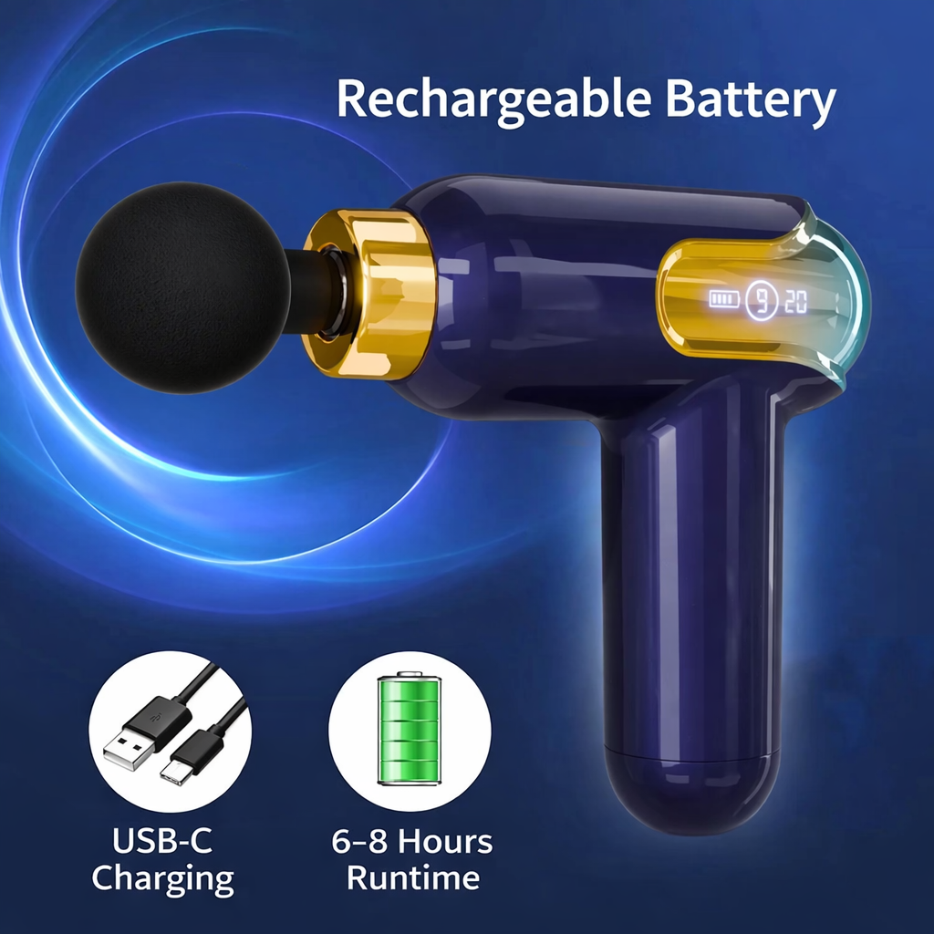 Built with a convenient rechargeable battery, this massage gun is easy to power up and ready whenever you need it. Enjoy cordless use, hassle-free charging, and reliable performance for daily muscle relief at home, at the gym, or on the go.